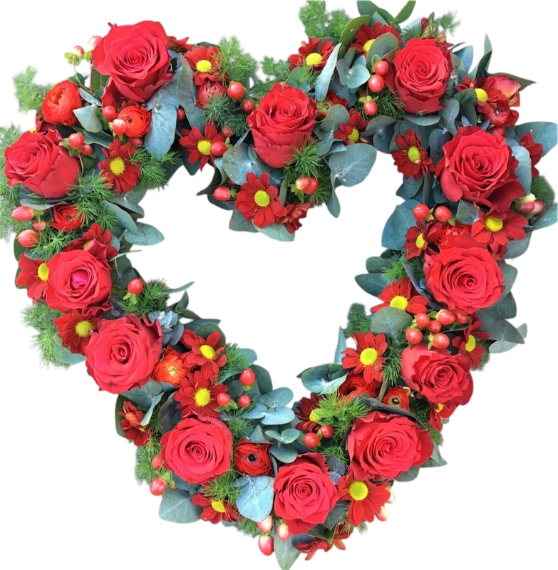 Luxury Red roses to create this beautiful loose open heart tribute with other seasonal flowers and foliage.